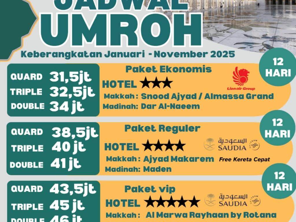 - Perlengkapan : Koper Kabin, Koper Bagasi, Tas Passport, Tas Sandal, Kain Ihram & sabuk/Mukena, Bantal Leher, Buku Manasik, Kain Seragam, Syal